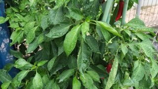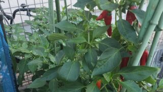 2025年9月8日 唐辛子のみが赤く色づいてきました。 今年も2種類植えたのですが、右の旨辛唐辛子は成長がイマイチで、左の激辛韓国と...